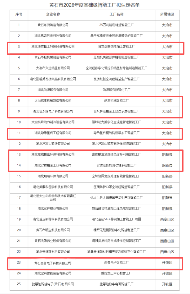 为贯彻落实国务院办公厅《制造业数字化转型行动方案》,构建智能工厂、解决方案、标准体系“三位一体”工作体系,根据《省经信厅办公室关于开展2026年度智能工厂梯度培育的通知》,市经信局开展了黄石市2026年度基础级智能工厂申报评审工作。经企业申报、各县市区经信部门推荐、专家评审、相关部门联合审核,拟认定东贝铸造等25家企业为2026年度基础级智能工厂。